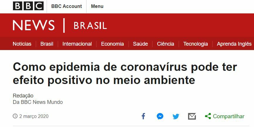 A matéria sobre a qualidade do ar, aliás, é da Agence France-Press, uma das mais requisitadas agências de notícias do mundo e foi republicada por diversos veículos. Entretanto, ela mesma se desdiz. A maioria dos efeitos mais graves da poluição do ar são causados por exposições à longo prazo, e não temos como saber qual o impacto da pandemia na poluição nesse período. Existem aqueles que são otimistas e acreditam que a crise irá modificar os hábitos de consumo das pessoas mesmo após a pior fase ter passado, como mostra essa matéria da BBC , entretanto são apenas suposições .