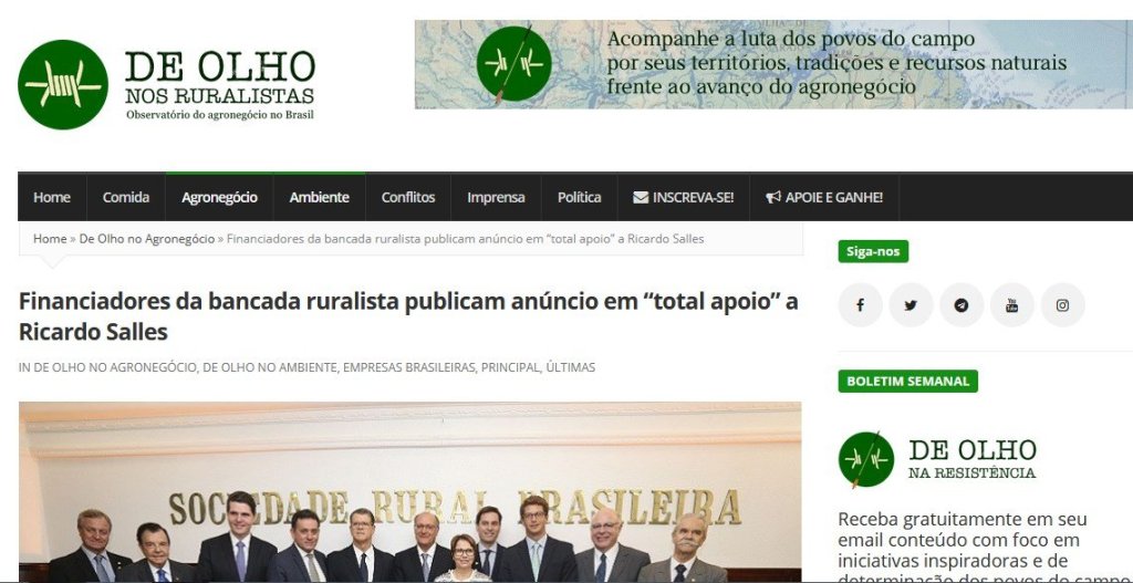 No dia 26 de maio, o texto de Alceu Luís Castilho informou detalhadamente as entidades responsáveis por veicular anúncio de apoio à gestão de Ricardo Salles no Ministério do Meio Ambiente. A publicação retomou levantamento realizado pelo próprio portal em 2019 com a lista de empresas que financiam a Frente Parlamentar Agropecuária através de associações do agronegócio brasileiro. O assunto foi retomado por conta do discurso de Salles durante a reunião ministerial de 22 de abril, em que o ministro defendeu aproveitar o foco da cobertura jornalística da pandemia para “ir passando a boiada” e afrouxar ainda mais os regramentos das políticas públicas ambientais. Na mesma semana, também repercutindo a frase de Salles, Observatório do Clima, ClimaInfo e Greenpeace Brasil iniciaram uma campanha nas redes sociais intitulada #nomeaosbois, pela qual cobraram posicionamento público das empresas representadas pelas entidades que assinaram o manifesto em apoio ao ministro. Neste caso, o jornalismo engajado esteve em sintonia com outras estratégias de comunicação que buscaram dar visibilidade à pauta e mobilizar o debate público sobre as responsabilidades do governo e do setor privado na crise ambiental.