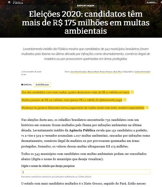Assim como a Plataforma Ambiental Municipal, a ferramenta criada pela Agência Pública para consulta dos nomes dos candidatos com multas ambientais em todo o país, disponível aqui, também teve pouca expressão na mídia comercial. Esta iniciativa foi apresentada em uma ampla reportagem da Agência, veiculada em 11/11/20, que trouxe um levantamento que revela que 152 candidatos a prefeito, 71 a vice e 529 a vereador acumulam 1.017 multas ambientais por infrações como desmatamento, comércio ilegal de madeira ou por provocarem queimadas em áreas protegidas. Os valores dessas multas, somados, ultrapassam R$ 175 milhões.
