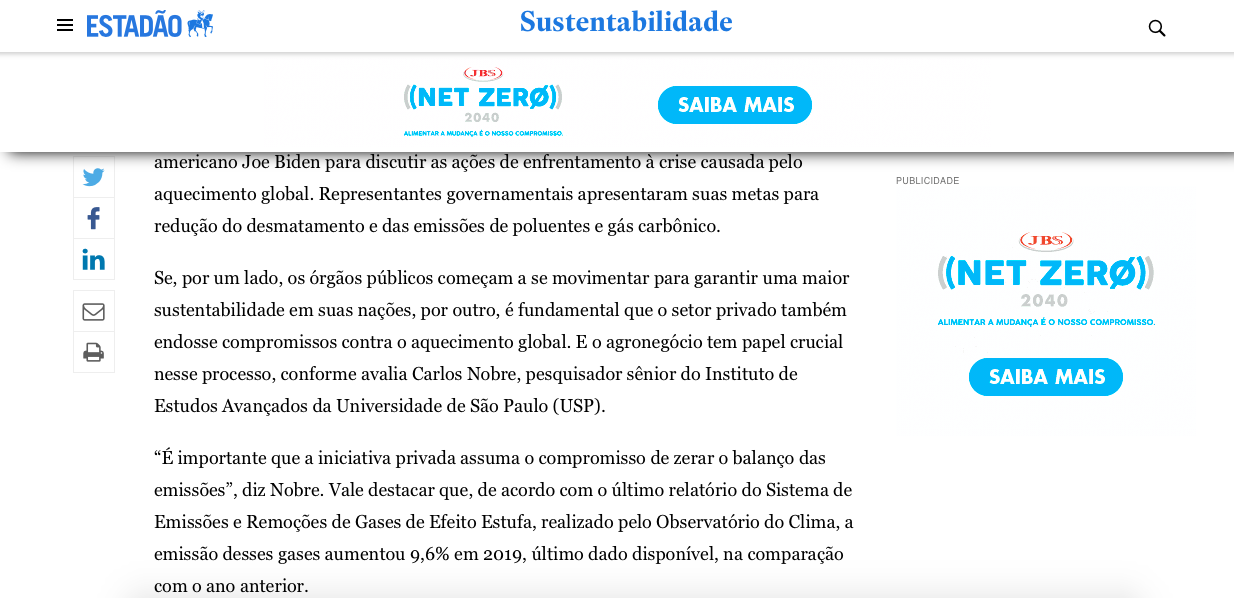 Um exemplo recente é o Estadão Blue Studio, do jornal O Estado de S. Paulo, que nos últimos dias entregou diversos conteúdos relacionados ao ambiental sob o guarda-chuva do projeto Retomada Verde, lançado no ano passado. O argumento central do Retomada é, justamente, dar conta de um “movimento global” que estaria ganhando espaço no Brasil, “com empresários, economistas e personalidades endossando a necessidade de fortalecimento da bioeconomia, de cidades mais sustentáveis e de um novo modo de vida e consumo”.