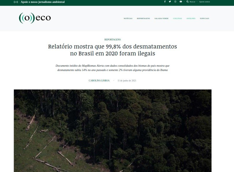 A equipe do MapBiomas concluiu que o desmatamento está crescente em todos os biomas e é, em sua vasta maioria, composto de casos de atividades ilegais. Mais de 70% se dá em domínios privados e há possibilidade de responsabilização de ⅔ das áreas desmatadas. No entanto, também apontam que 99% das propriedades rurais não tiveram desmatamento em 2020 – e sofrem com a impunidade daqueles que infringem as leis. Para tratar deste tema neste Observatório de Jornalismo Ambiental, fizemos uma busca exploratória no Google, em busca da repercussão nos jornais, com os termos “Relatório inédito do MapBiomas Alerta”, na data de 13 de junho. A partir das publicações encontradas, pudemos conferir que houve boa repercussão das informações, tanto em portais, jornais alternativos e sites especializados ou institucionais, quanto em jornais e portais mais tradicionais da imprensa brasileira.