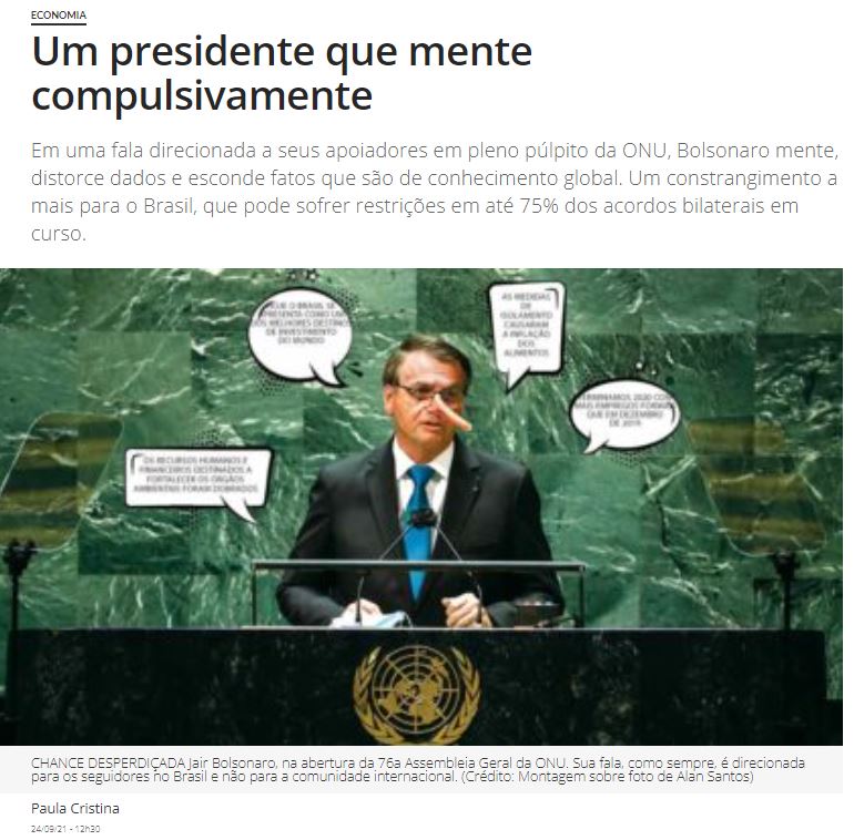 Na última terça-feira, dia 21 de setembro, durante discurso na abertura da Assembleia Geral da Organização das Nações Unidas (ONU), mais uma vez, tivemos uma autoridade pública à serviço da disseminação de informações descontextualizadas e manipuladas para endossar sua própria realidade. O presidente do Brasil, Jair Bolsonaro, exagerou, tirou do contexto e pronunciou inverdades a respeito do meio ambiente, conforme checado pelo Fakebook.eco, uma iniciativa de checagem dos fatos do Observatório do Clima.