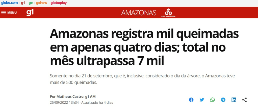 A matéria de Matheus Castro trata sobre as queimadas acontecidas no estado do Amazonas em setembro de 2022 apresenta o fenômeno de forma alarmista, sem levar em consideração que a população local necessita preparar áreas para a agricultura visando a produção de alimentos. Segundo Matheus Castro, somente em quatro dias – de 21 a 24 de setembro – foram registrados 1.043 focos de queimadas, totalizando 7.286 focos de calor somente no mês de setembro. O consolidado para o ano de 2022 seria de 17.798 incêndios, o pior cenário desde 1998, quando o INPE começou a fazer o monitoramento das queimadas. Esse seria o pior mês de setembro desde 1998. Matheus Castro apenas cita que os focos de queimadas se concentram nos municípios periféricos do do Amazonas: Lábrea e Boca do Acre, ambos no sul do Estado do Amazonas.