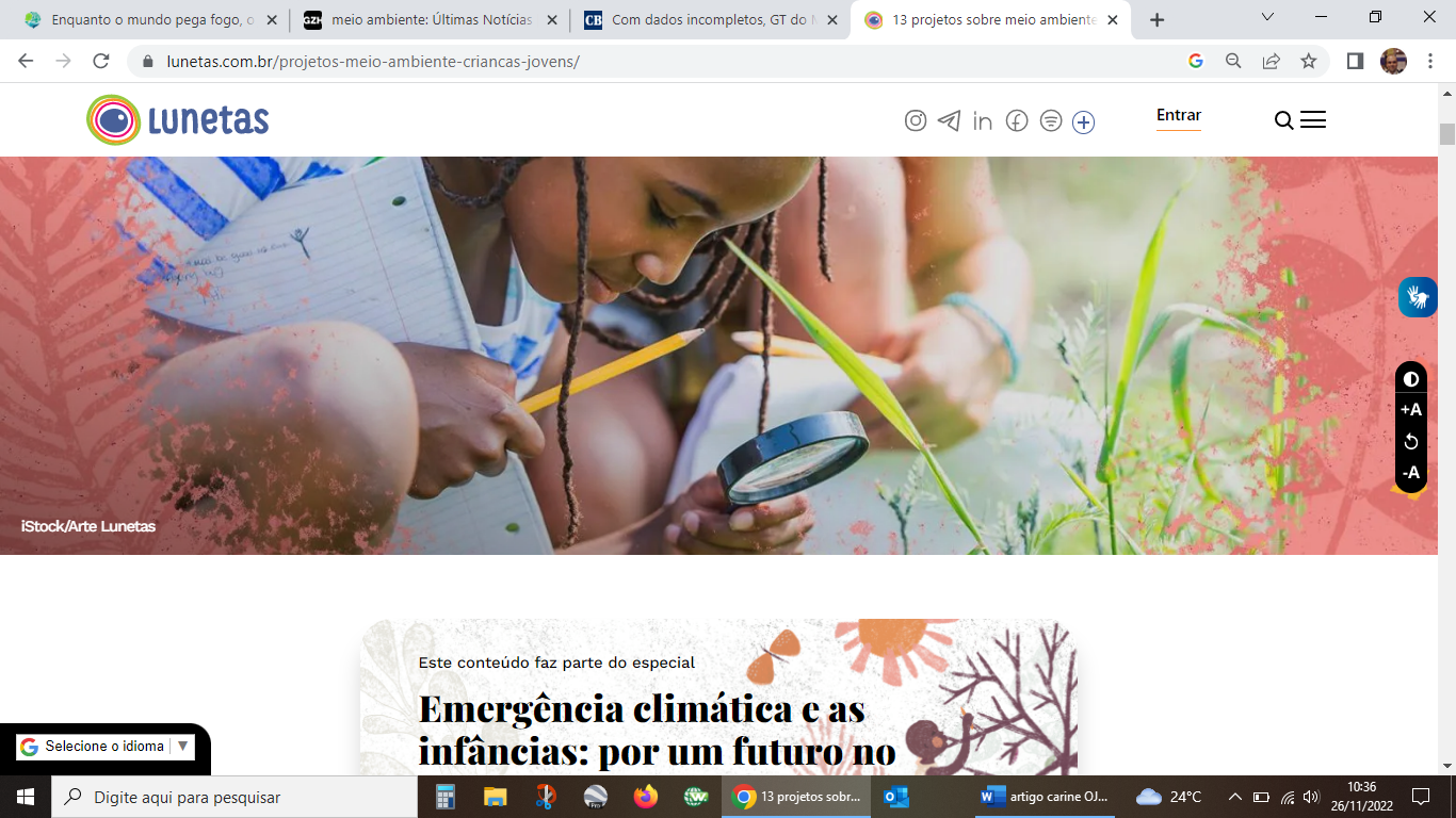“Treze projetos sobre meio ambiente criados por crianças e jovens” (https://lunetas.com.br/projetos-meio-ambiente-criancas-jovens/), integra o especial “Emergência climática e as infâncias: por um futuro no presente”, proposta lançada pelo Lunetas em setembro de 2021 e que se estendeu ao longo de 2022. Durante todo o ano foram publicadas reportagens com conteúdos aprofundados por jornalistas e especialistas, que mostram os diferentes impactos da emergência climática às crianças brasileiras, além de reflexões, inspirações, caminhos e soluções para combater a crise.