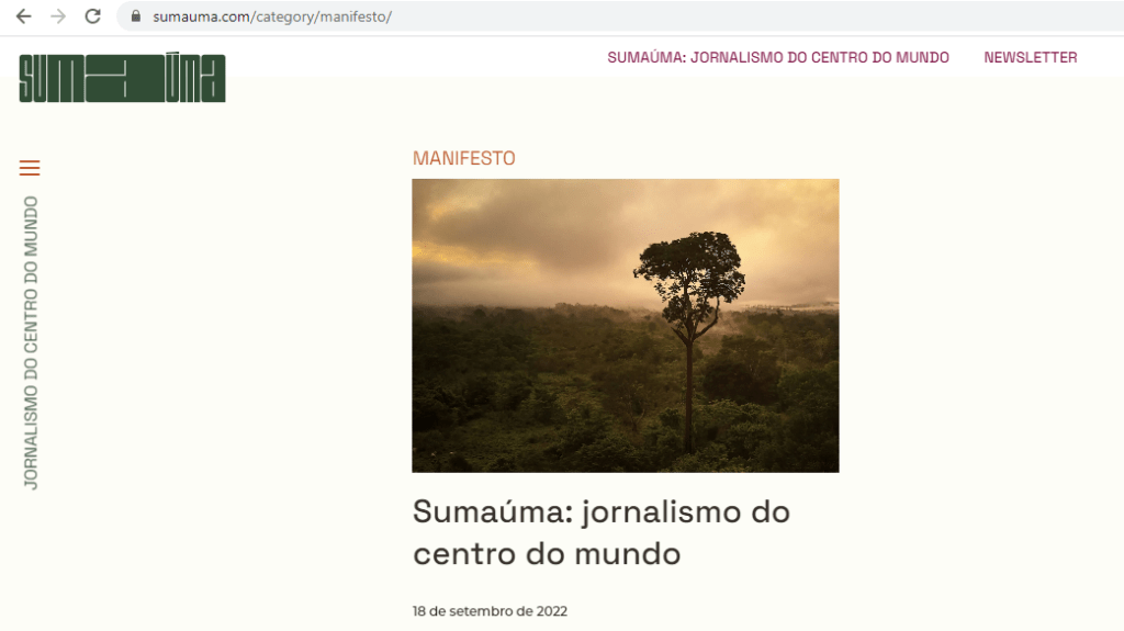 Na última semana, o Brasil e o mundo ganharam um novo portal de jornalismo, o Sumaúma, intitulado “Jornalismo do Centro do Mundo”. O portal/newsletter pretende trazer notícias e grandes reportagens produzidas diretamente da Amazônia, a partir do olhar dos povos da floresta. O manifesto de lançamento do projeto destaca que este se “propõe a debater e jogar luz aos temas urgentes que colocam a Amazônia no epicentro da questão ambiental do planeta”. Os criadores do projeto acreditam que, em um mundo em colapso climático, os centros mais essenciais “não são Washington ou Pequim, não são os bunkers do sistema financeiro, mas os enclaves de vida do qual depende a nossa sobrevivência, como os oceanos, as florestas tropicais, os vários biomas”.