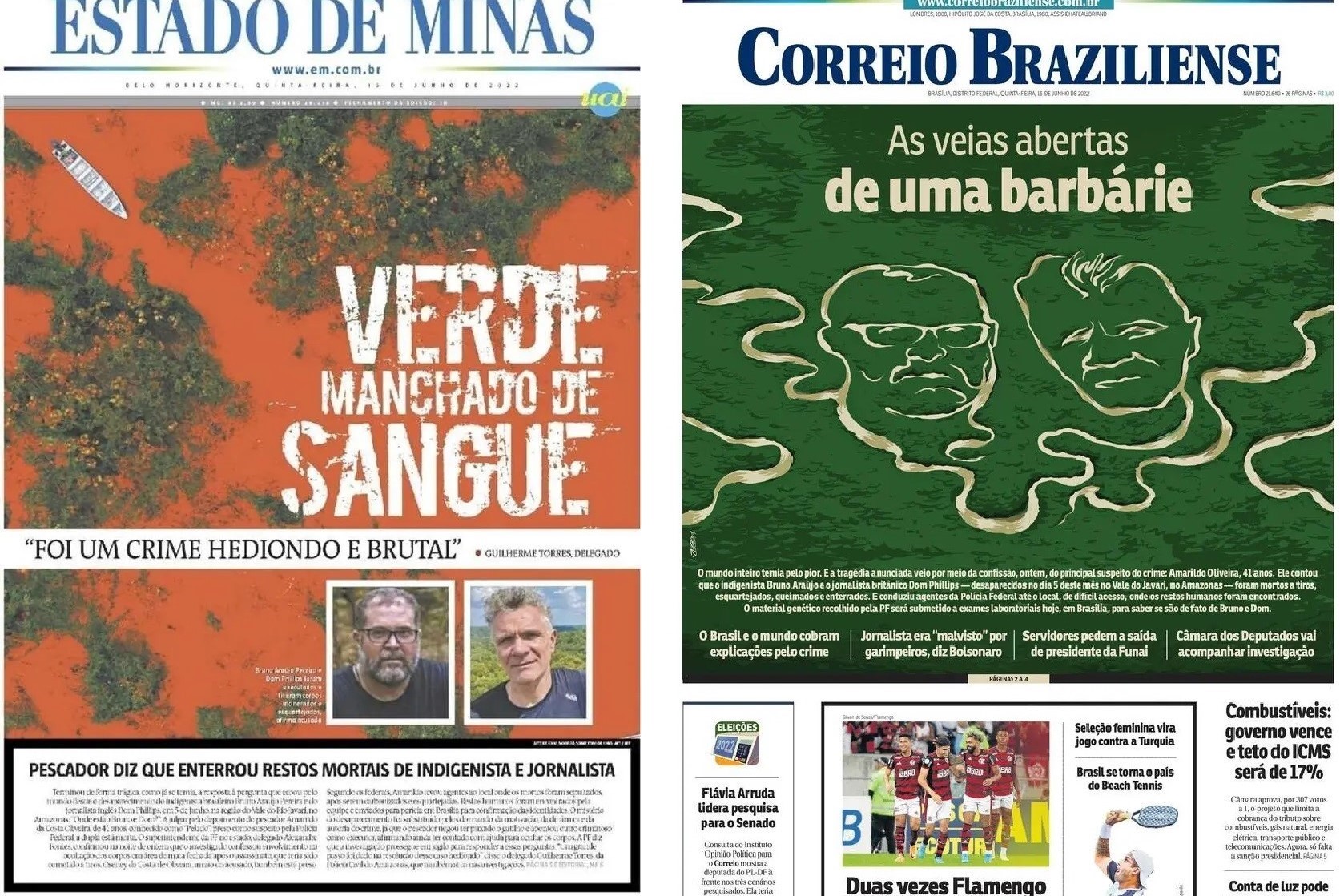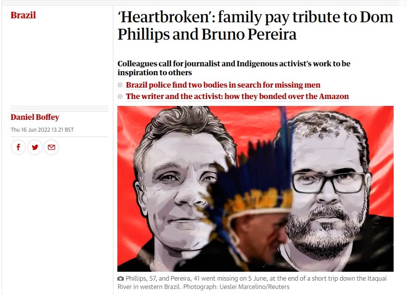 A semana foi marcada pela confirmação dos assassinatos de Bruno Pereira e de Dom Phillips. A notícia virou manchete dos principais jornais do País e teve imediata repercussão internacional, principalmente pela morte do jornalista britânico, que escrevia para o The Guardian e já tinha colaborado com Washington Post, The New York Times e Financial Times. Ambos eram conhecidos pela dedicação na preservação da floresta amazônica e na defesa das causas indígenas. E por isso foram mortos.