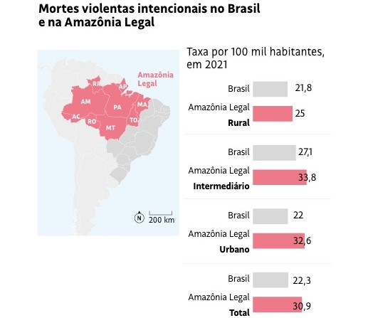 Na última semana foi divulgado o Anuário Brasileiro da Segurança Pública, relatório que reúne dados acerca da violência e suas diversas expressões em todos os estados da federação. A publicação é fruto de um esforço de pesquisa coordenado pelo Fórum Brasileiro de Segurança Pública e traz informações fornecidas por órgãos oficiais – como forças policiais e secretarias – referentes a 2021. A imprensa em geral celebrou a diminuição no número de mortes violentas no país, que caiu ao menor patamar em uma década. Ainda que os dados apresentados indiquem uma tendência de queda da violência, uma ressalva chama atenção: os homicídios aumentaram na Amazônia.
