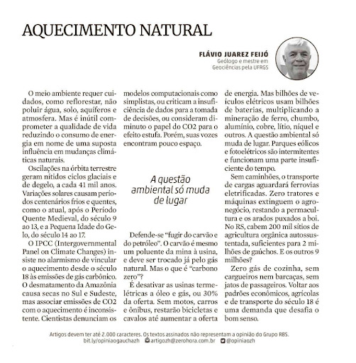 Após apenas um mês de emissão do relatório, o jornal Zero Hora (ZH) publicou um infeliz artigo de opinião de Flávio Juarez Feijó chamado “Aquecimento Natural”. Apesar de ser geólogo e ser mestre em geociências, Flávio foi abraçado pelo jornal da capital gaúcha por suas opiniões descabidas que não possuem nenhum embasamento científico.