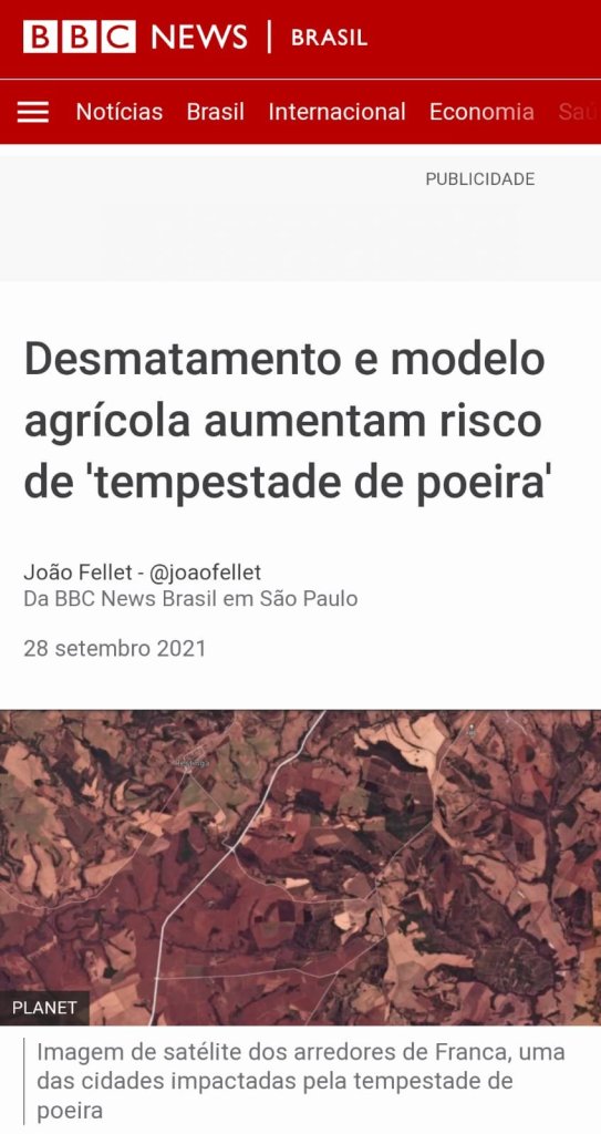 As fotografias e vídeos da tempestade de poeira que atingiu 25 cidades do nordeste de São Paulo e do Triângulo Mineiro no dia 26 de setembro, com nova ocorrência em 1º de outubro, varreram as mídias sociais. O “haboob” – nome dado pelos meteorologistas para as tempestades de areia nas regiões mais áridas do planeta – pautou os veículos de comunicação, com destaque para a reportagem da BBC News Brasil assinada pelo jornalista João Fellet e intitulada “Desmatamento e modelo agrícola aumentam risco de ‘tempestade de poeira’”. A notícia, em https://bbc.in/3zVYvIc, aborda a relação do fenômeno com a existência de grandes porções de solo seco e sem cobertura vegetal na região, onde há forte presença do agronegócio.
