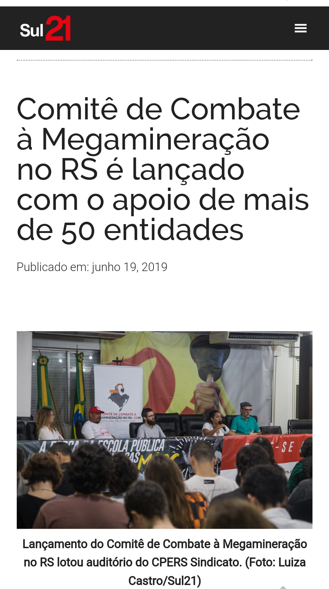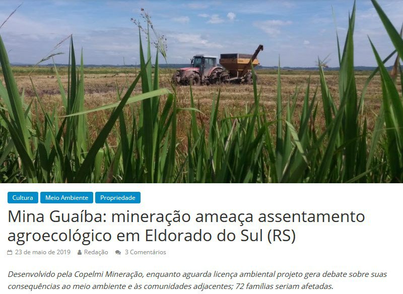 Na matéria publicada pelo Sul21 em 19 de junho, pode-se perceber que o jornalista Marco Weissheimer consegue dar voz a muitas fontes a respeito da mineração. A reportagem trata da formação de um comitê que envolve mais de 50 entidades contrárias aos projetos de megamineração no Estado e ouviu todos que participaram da reunião de formação do comitê, mostrando a preocupação dos movimentos com relação aos projetos que estão em processo de licenciamento ambiental.