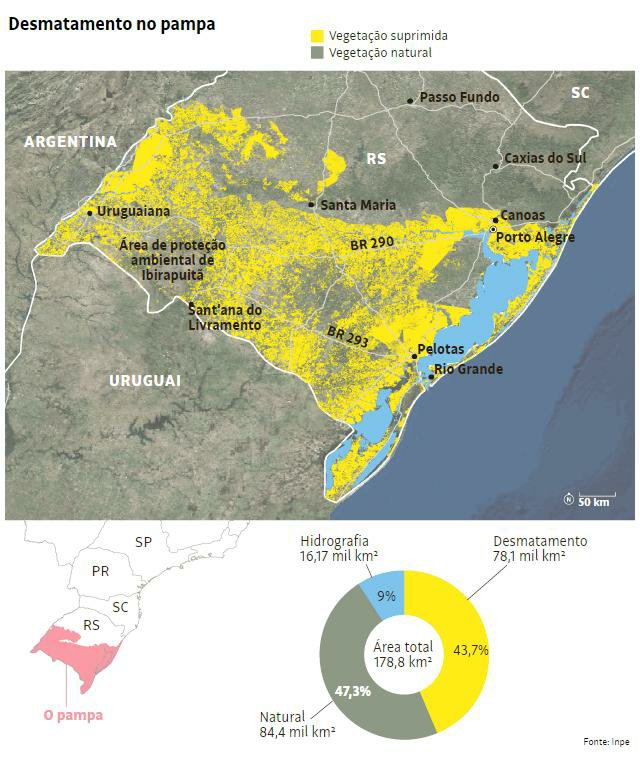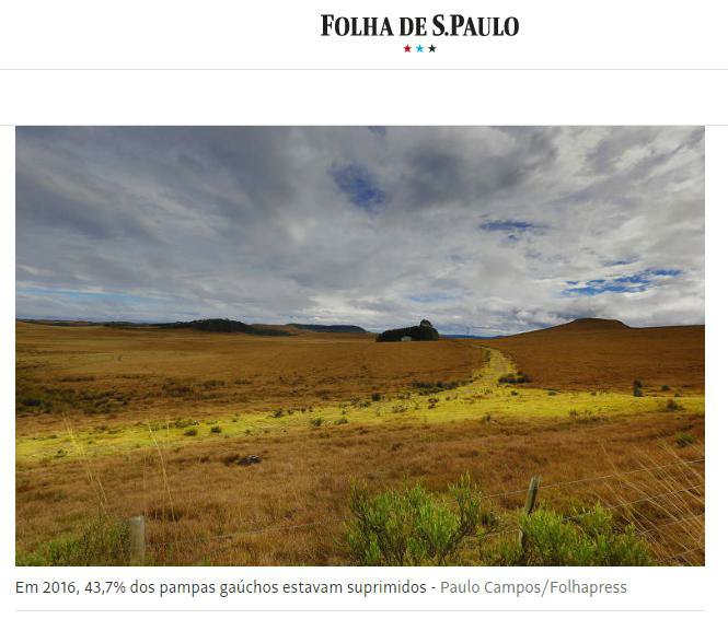 Mas se isso é verdade, também é verdade que há sinais de que um jornalismo sério e comprometido com a qualidade da informação não só é possível, como já existe em alguns casos. Um exemplo disso é a matéria “Pampa gaúcho sofreu desmate de 44%, aponta novo monitoramento do Inpe“, de autoria da jornalista gaúcha Paula Sperb, para a editoria de ambiente do site do jornal Folha de S.Paulo. Publicado em 5 de junho, o texto trata da questão do desmatamento do Bioma Pampa, trazendo dados inéditos do Instituto Nacional de Pesquisas Espaciais – Inpe, segundo o qual, em 2016, 43,7% da vegetação nativa já estava suprimida, ou seja, desmatada.