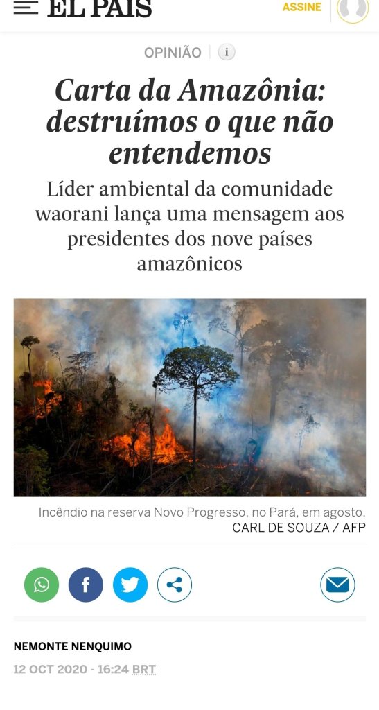 Esta frase da líder ambiental da comunidade waorani, Nemonte Nenquimo, é um dos apelos por ela escritos na Carta da Amazônia, uma mensagem direcionada aos nove presidentes de países amazônicos, publicada no jornal El Pais, em 12 de outubro, (Vale a pena a leitura na integra). Trata-se de uma carta escrita com conhecimento e sentimento, que clama respeito à floresta e aos povos indígenas. Nemonte Nenquimo destaca os milhares de anos que os povos indígenas levaram para conhecer a floresta Amazônica. “Entender suas formas, seus segredos, aprender a sobreviver e a prosperar com ela”, explica.