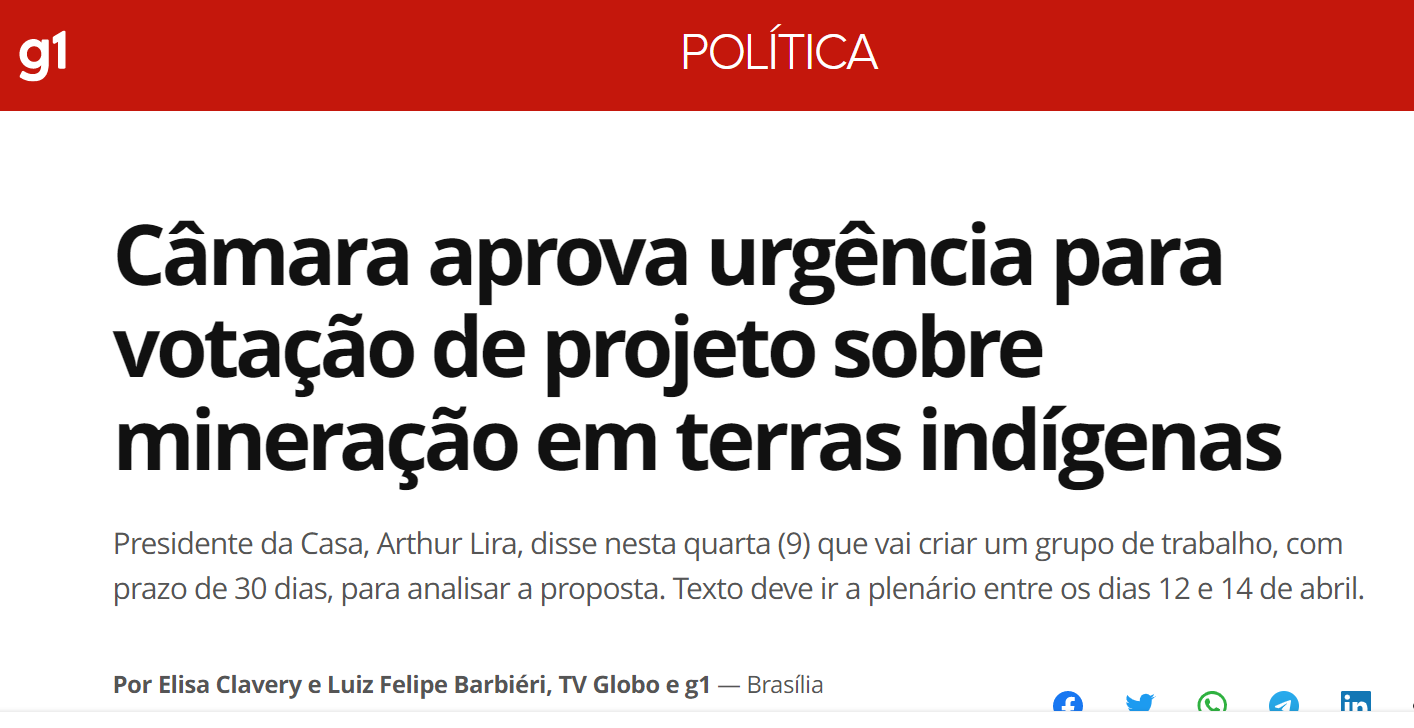 A aprovação do requerimento de urgência do PL foi título de matérias em diversos jornais do Brasil. No G1, a notícia Câmara aprova urgência para votação de projeto sobre mineração em terras indígenas, em um primeiro momento, parece se destacar ao adotar uma abordagem contextualizada que apresenta a proposta do projeto, os argumentos a favor e contra e o que o PL representaria na prática. No entanto, a matéria não é capaz de explicar ao leitor a complexidade socioambiental que envolve o PL 191/2020. Embora a proposta do projeto tenha como objetivo regulamentar uma prática que gera consequências nocivas para o meio ambiente e que possivelmente colocaria em riscos à vida de povos originários, esse aspecto parece ter sido esquecido. Em nenhum momento, o texto traz uma análise mais aprofundada de fontes especialistas em relação aos impactos que ocorrem na atividade de mineração.
